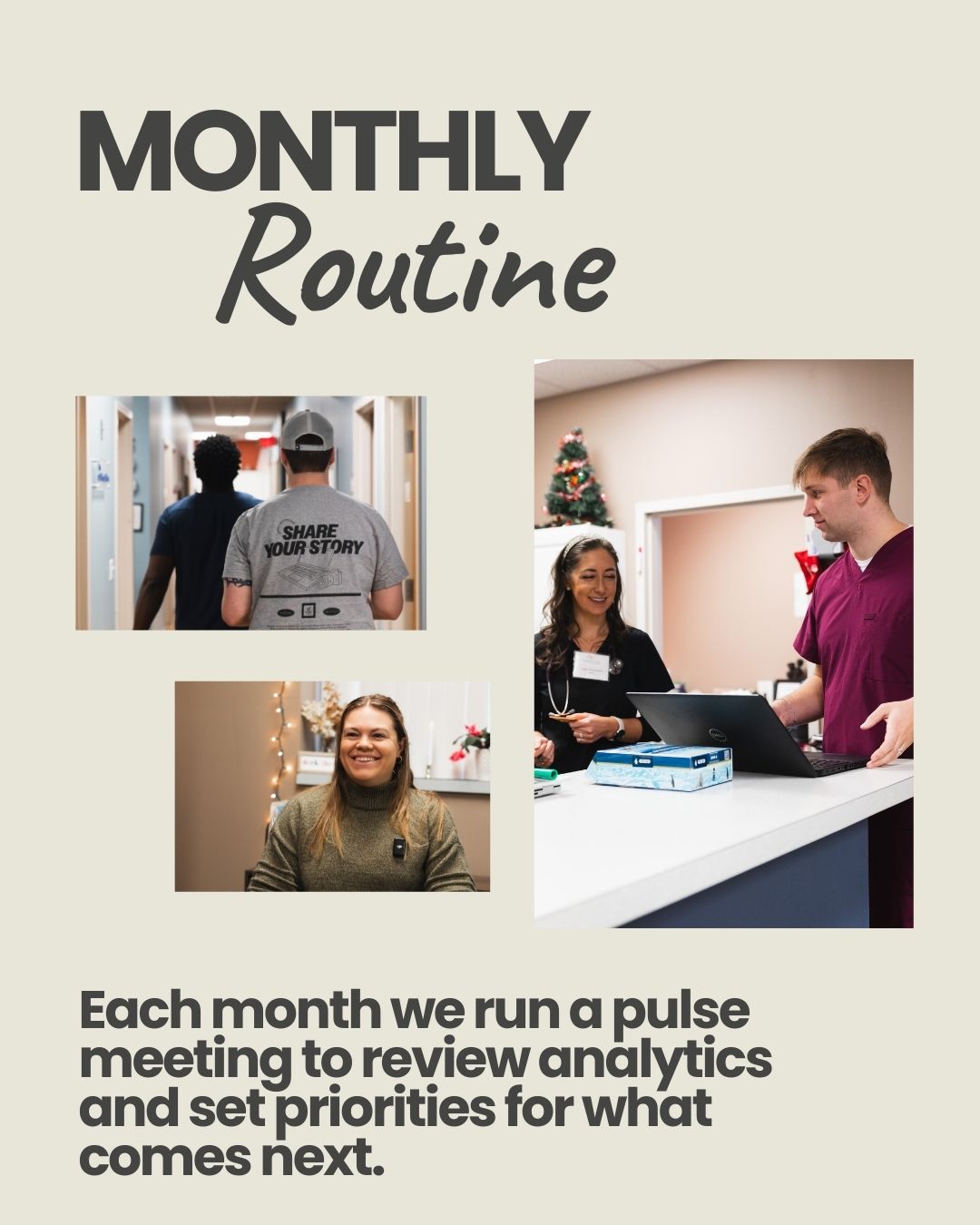 With the right team in place, we now run a monthly pulse meeting the first week of each month to review analytics and priorities ahead. This creates clarity. It creates accountability. It keeps everyone rowing in the same direction. Then once a month, we create photo and video content in a focused content day. That single day produces about four short videos and an album of photos that can be used across Facebook, Instagram, TikTok, LinkedIn, YouTube, and Google.