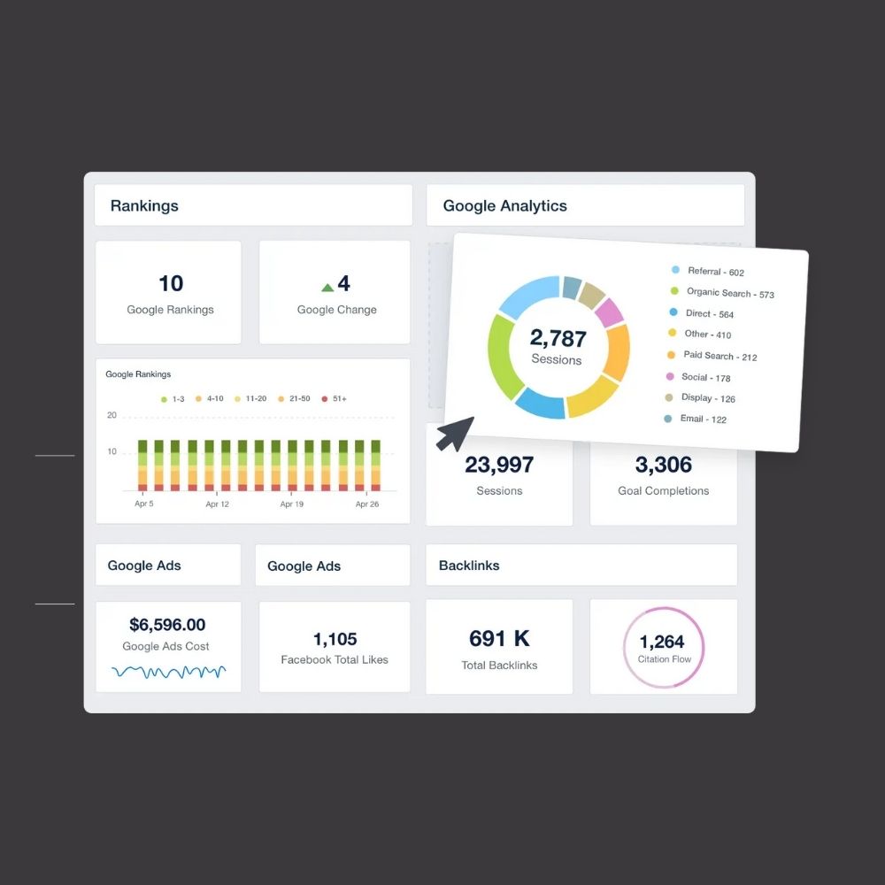 Connect all your platforms to create a clear, no-fluff dashboard that tracks the stuff that matters such as keyword rank tracker, Facebook, Instagram, Google Ads and Google My Business.